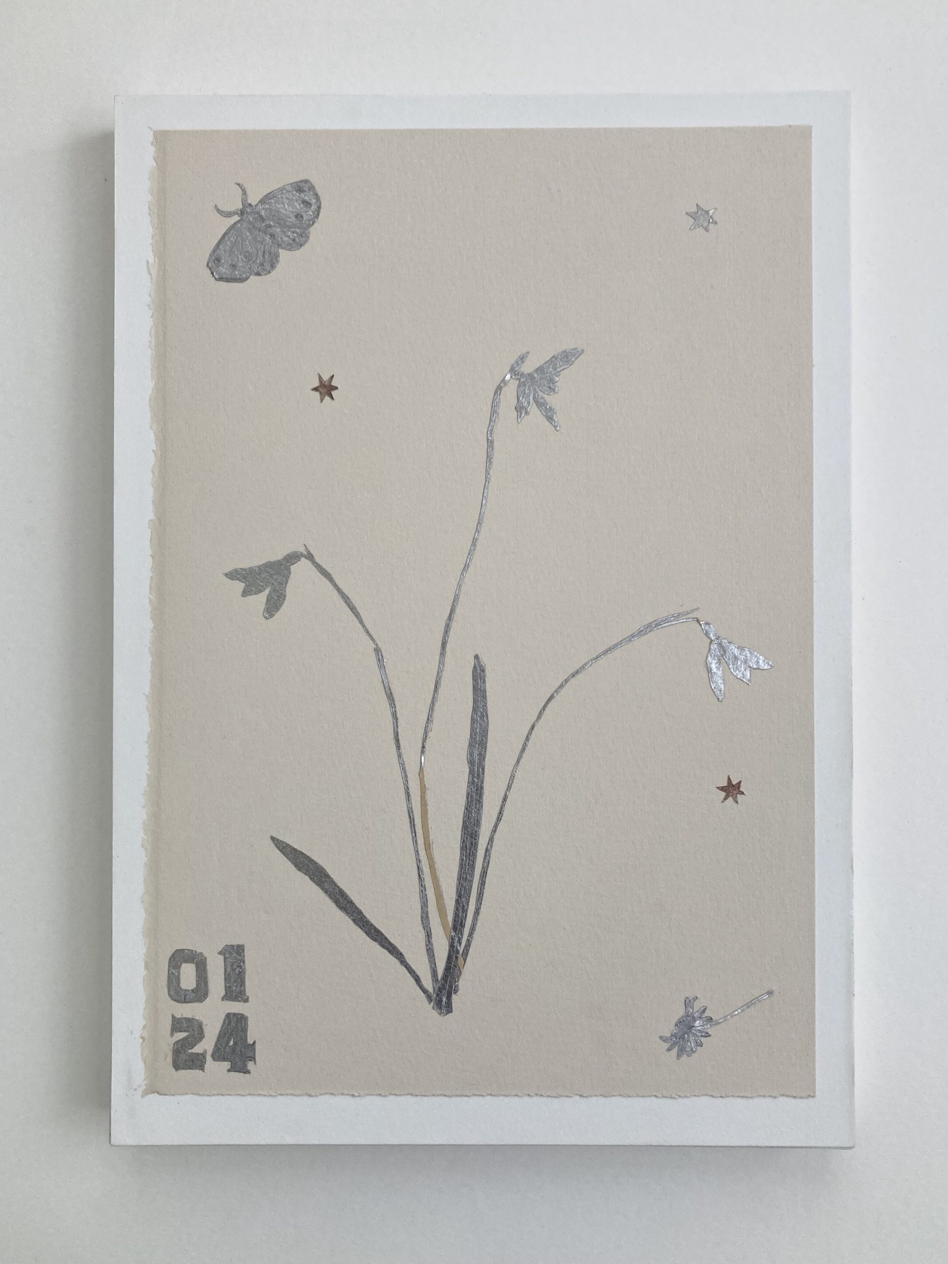 Snowdrop, Moth and Stars Paper, silver and metal leaf on paper mounted on wooden panel. 21cm x 30cm x 2cm. Unique. Please enquire here for availability & pricing