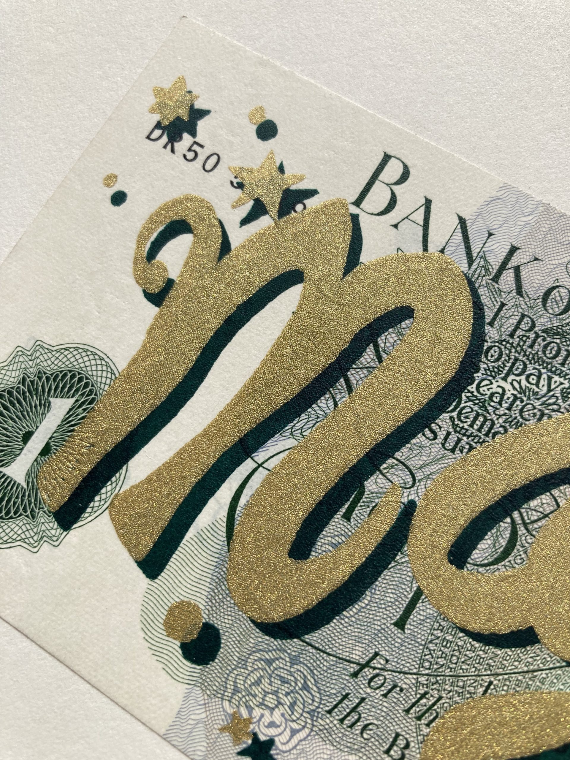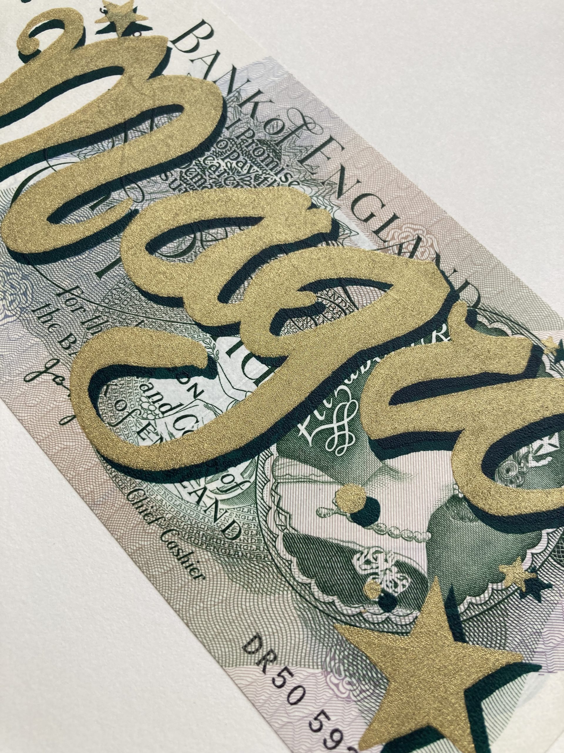 Two colour screen print on English One Pound note on Saunders Waterford paper. 26.5 x 19cm. Edition of 100, each signed and numbered.